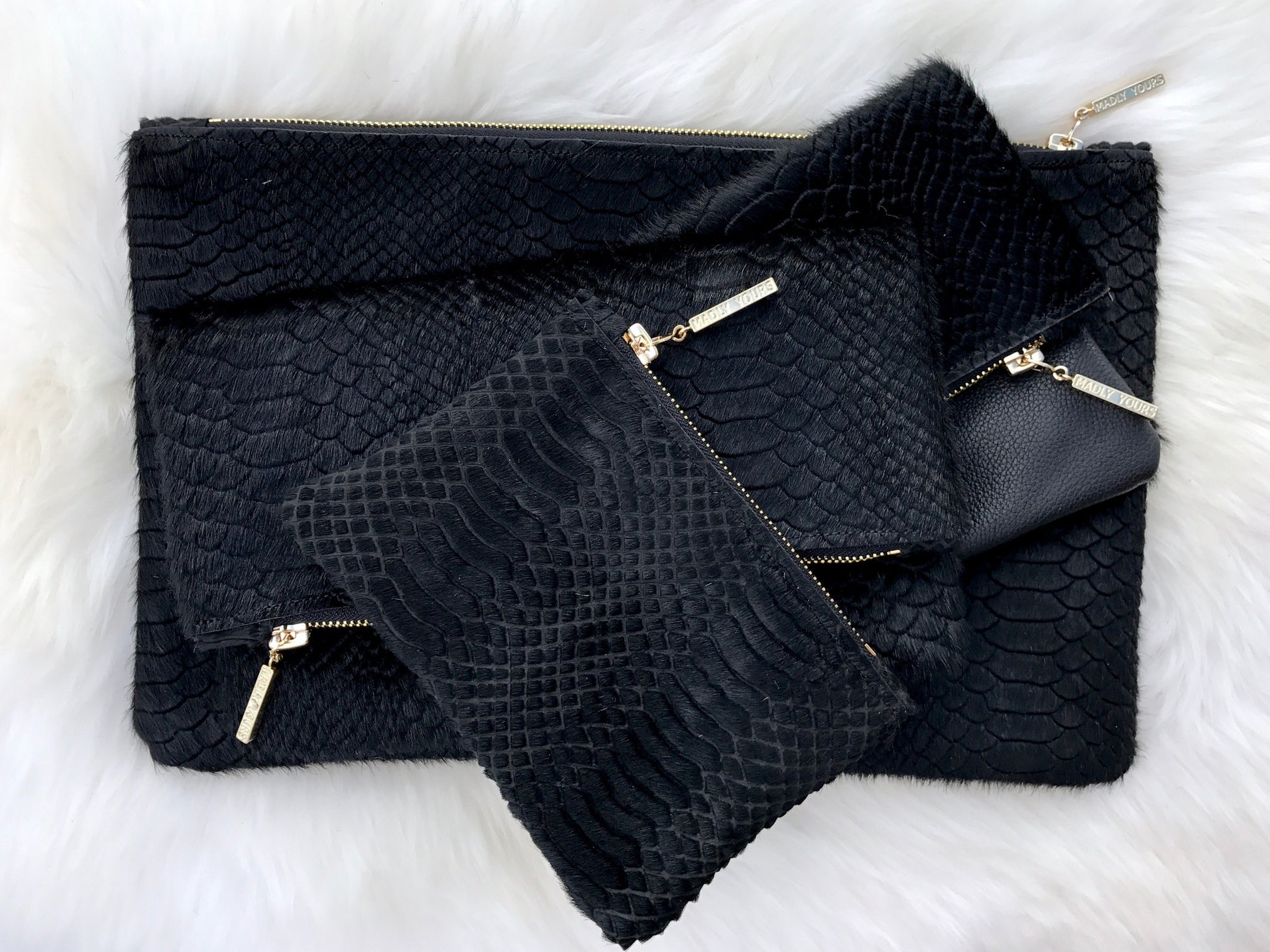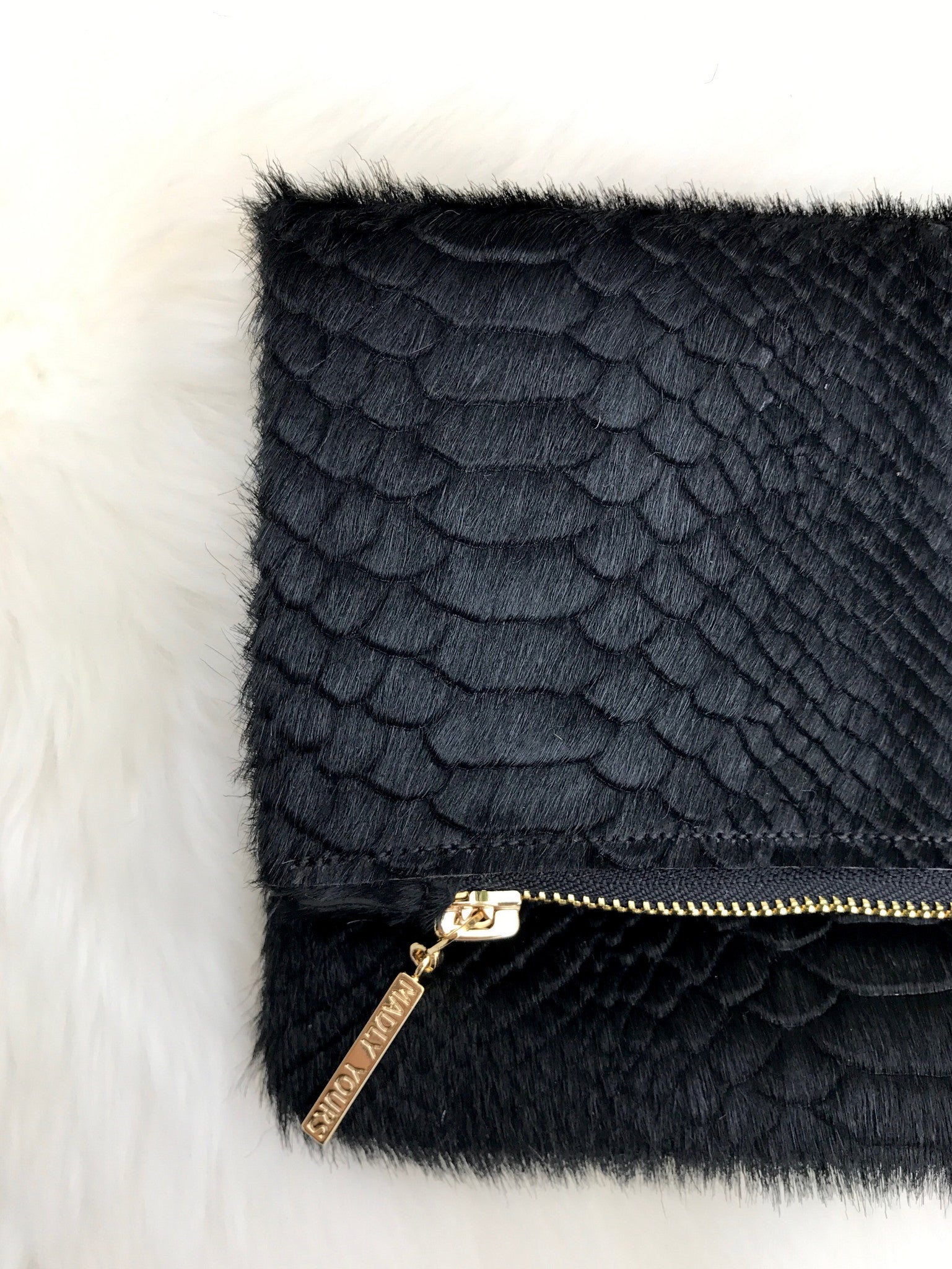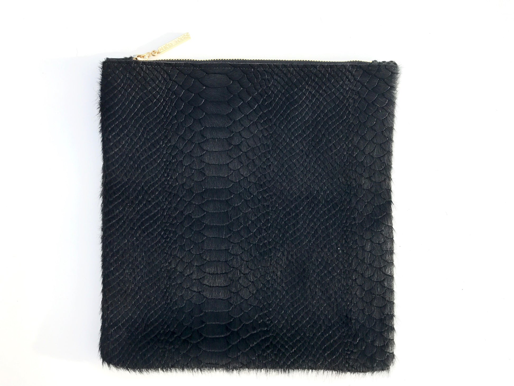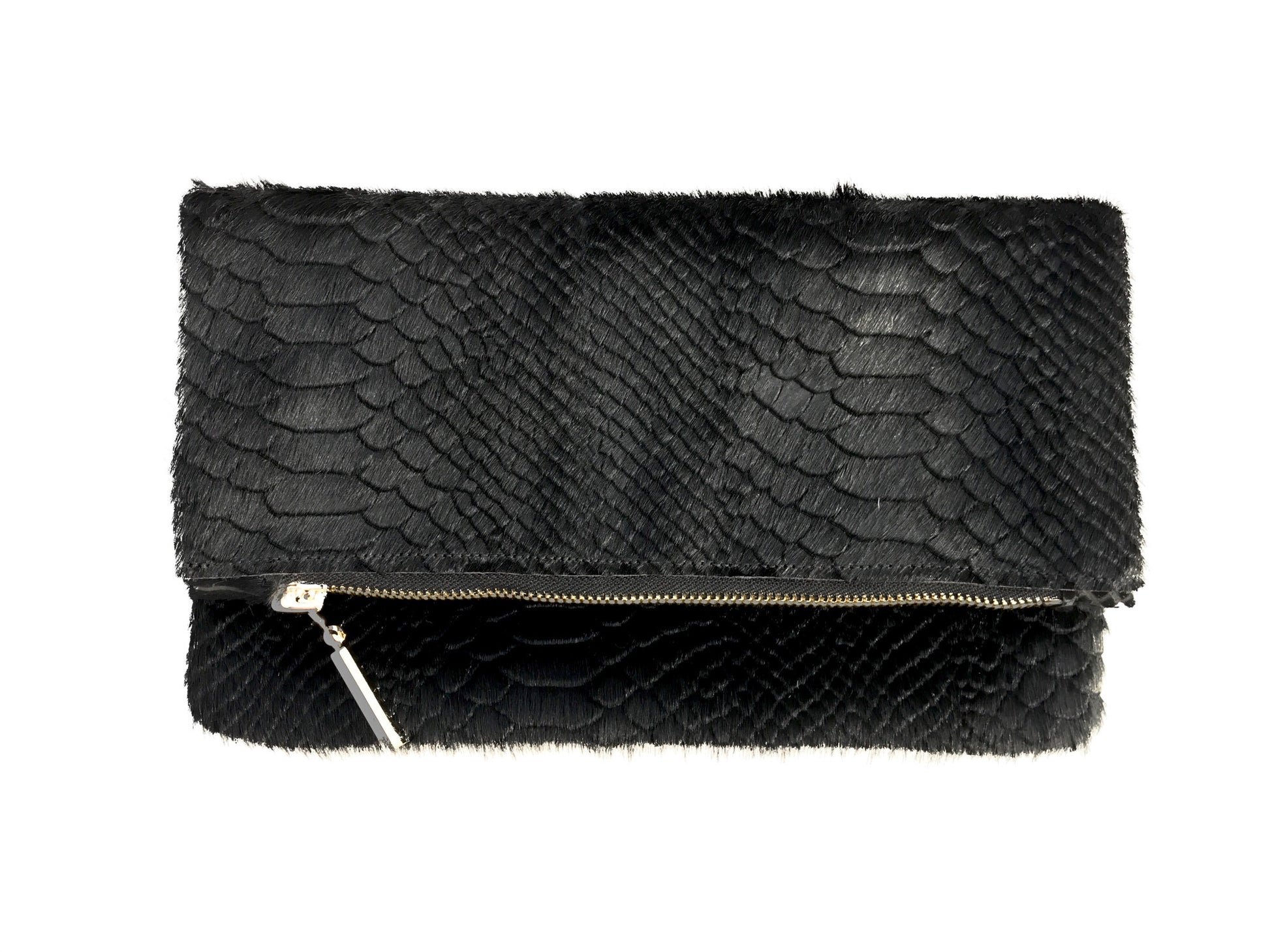 The CESCA Clutch is versatile in size, sleek and adds the perfect hint of sass to any outfit. This clutch is hand crafted out of the finest calf hair-on-hide, python embossed leather, fully lined and adorned with a gold plated zipper pull.